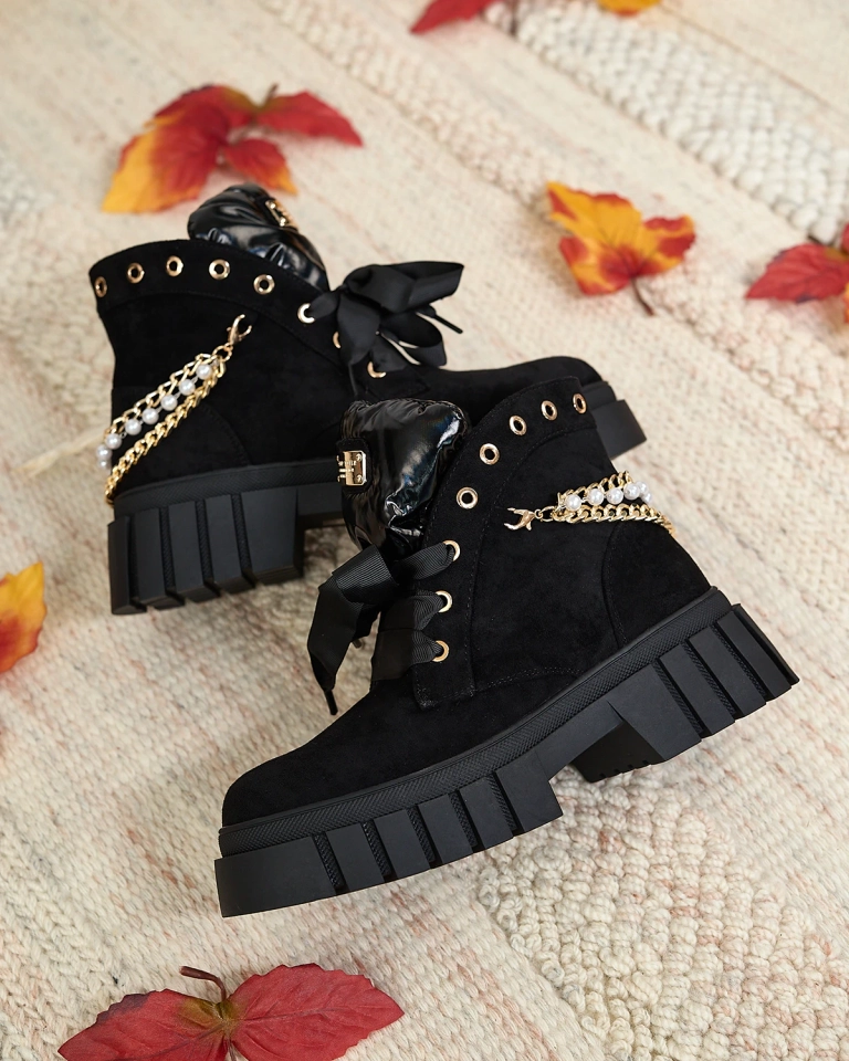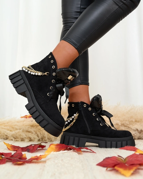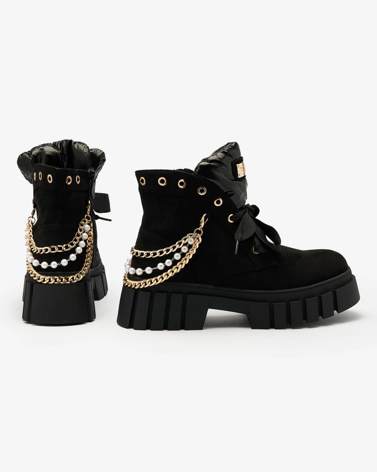 • Beautiful women's lace-up sides made of eco suede leather, inside filled with soft fur. In addition, detachable chains with pearls included. Perfect for creating stylish outfits! BLACK LADIES INSULATED BOOTS DAHAFF