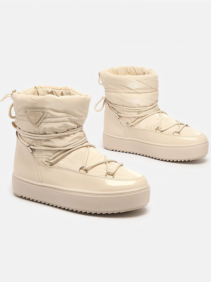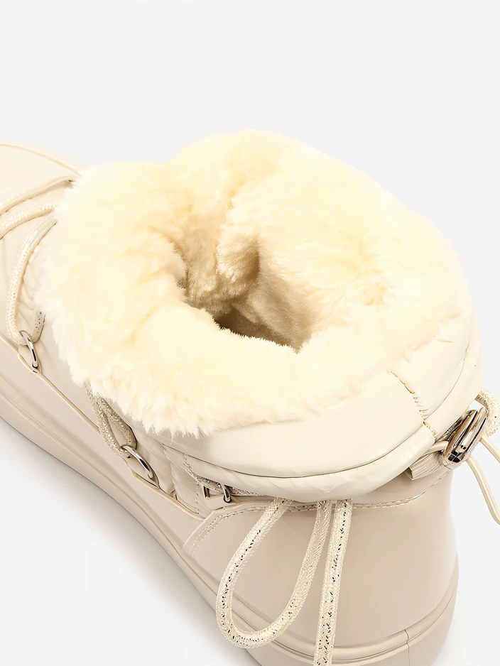 - Women's snow boots with an upper made of a combination of eco patent leather and a'la oilcloth material. Insulated inside in the form of fur, slip-on shoes. The model has a welt at the end of the upper. Ideal for winter!
