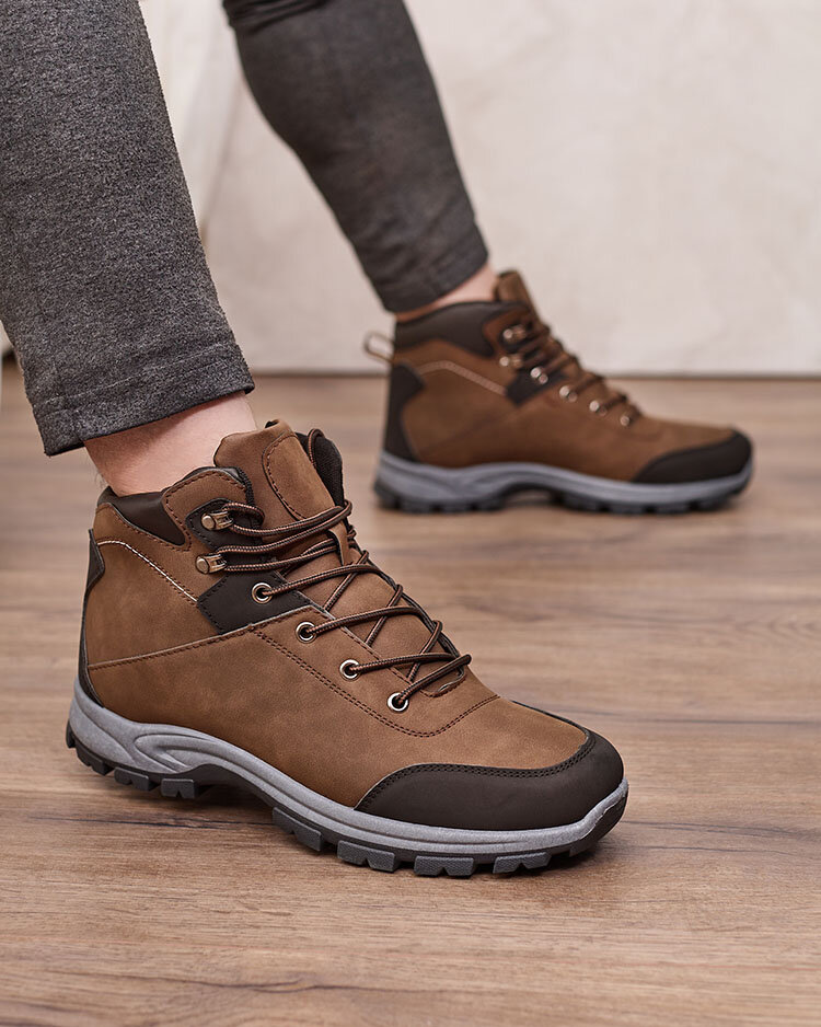 - Men's trekking trappers with laced upper. The material of construction is matte eco-leather, the middle of the shoes is insulated with thin foam. Ideal for winter time!