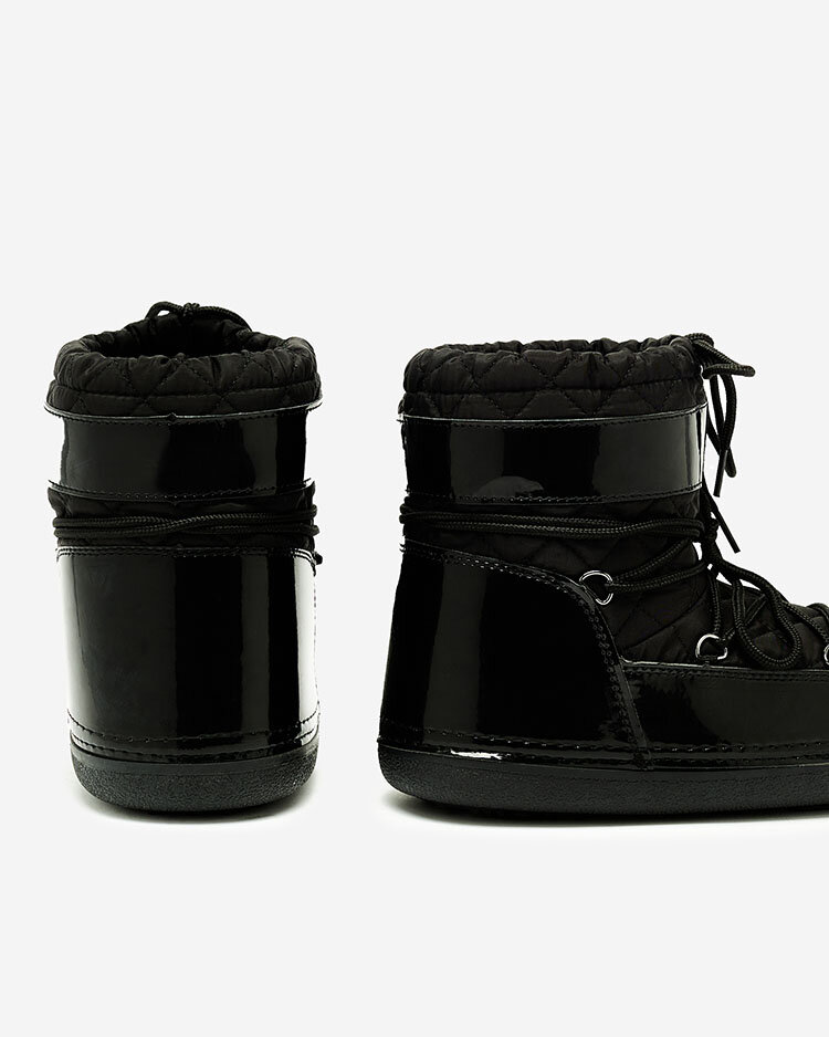 • Women's snow boots with upper made of a combination of eco patent leather and quilted fabric material. Lined with fabric inside, slip-on and lace-up footwear has a welt.