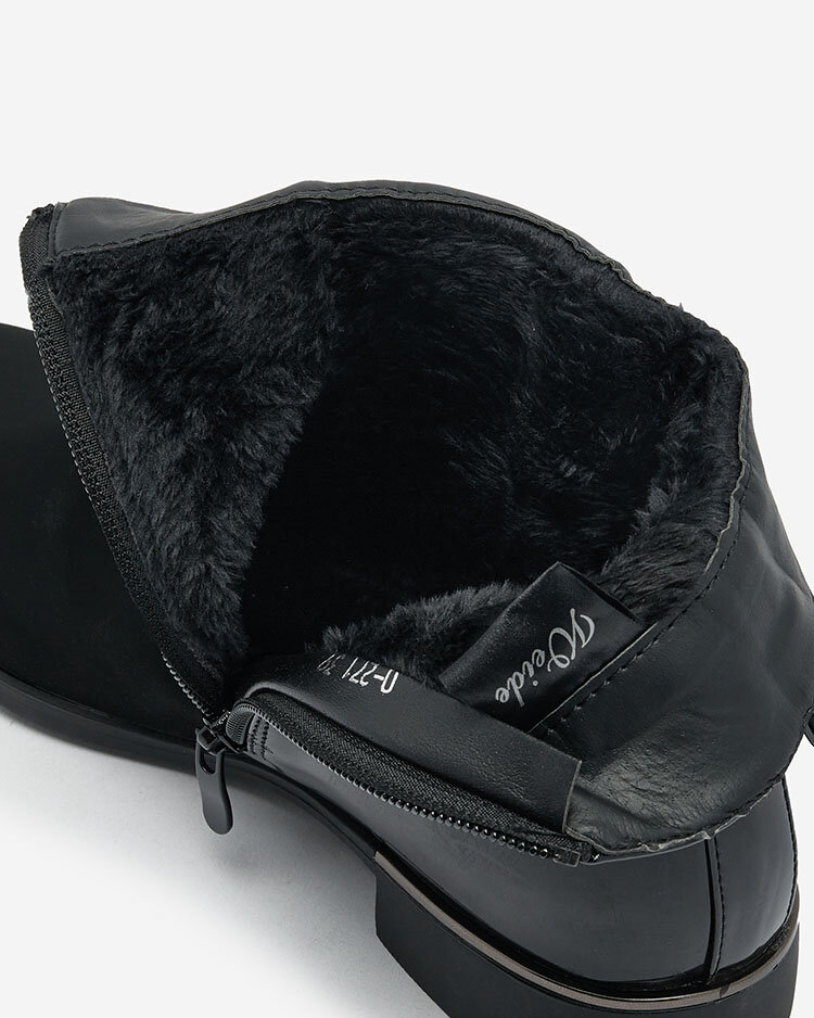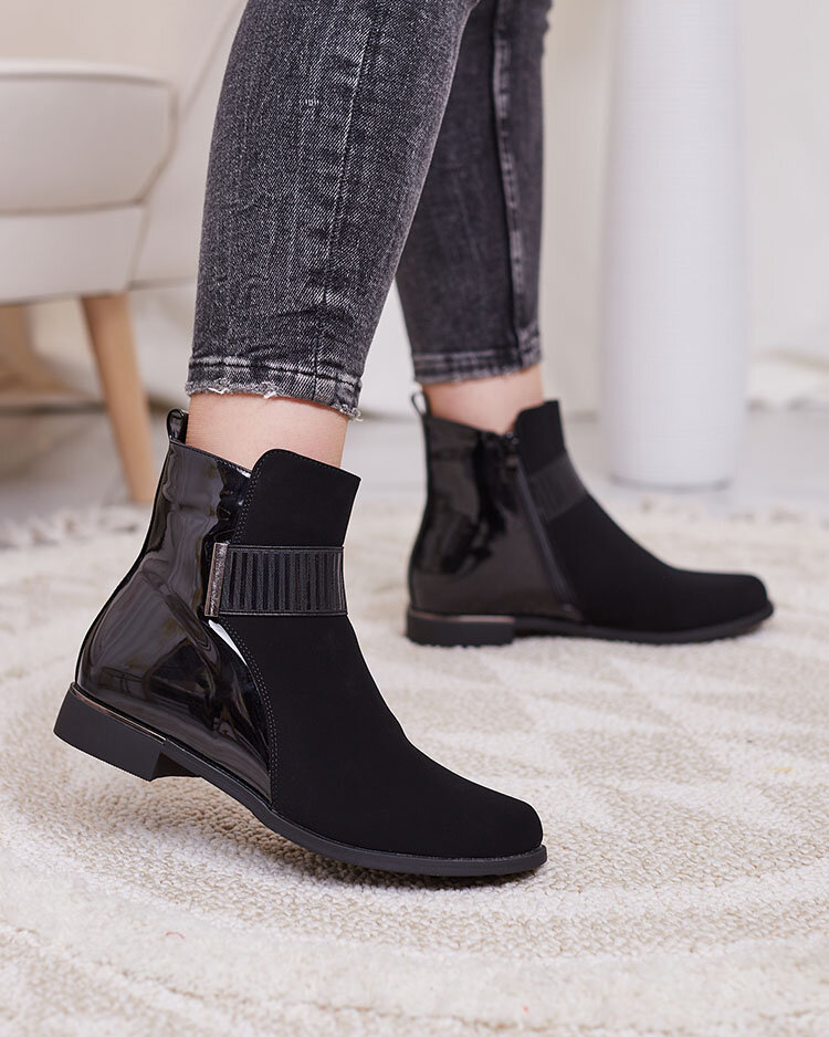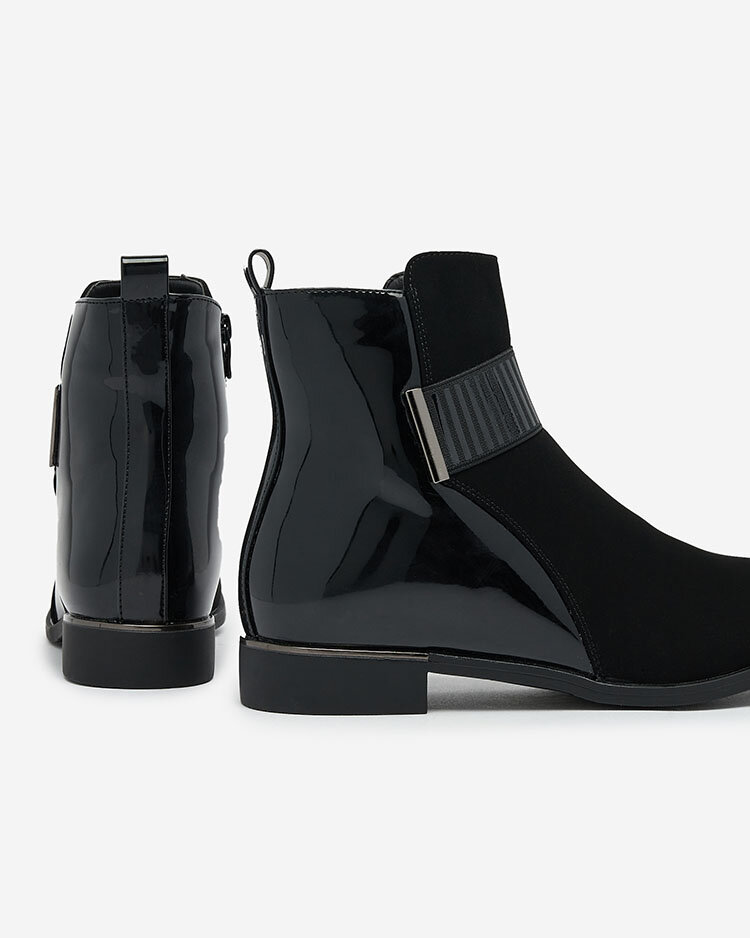 - Elegant women's boots with decorative strap. Zippered model, made of matte ecological leather and lacquered inserts. Equipped with a thicker sole for wearing comfort!