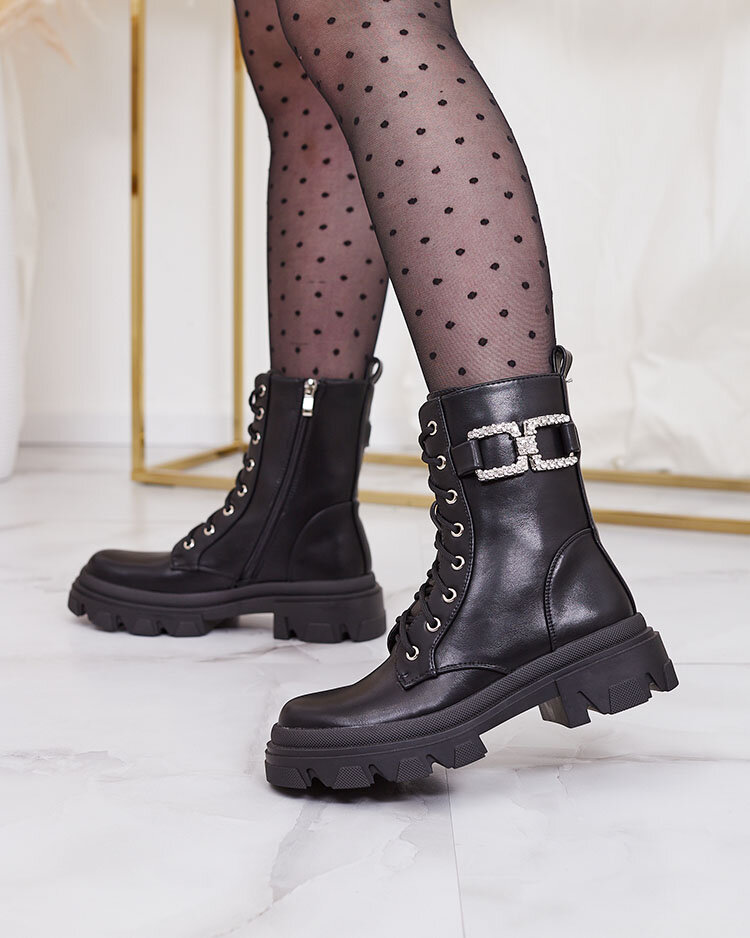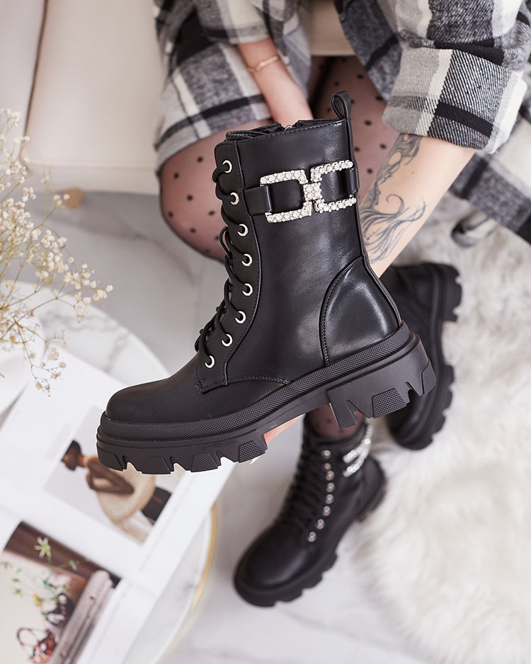 - Timeless women's lace-up boots on a thicker sole. The upper is made of matte ecological leather, the middle is lined with fur. The upper decorated with a buckle with zircons. This pair must be in your autumn closet!