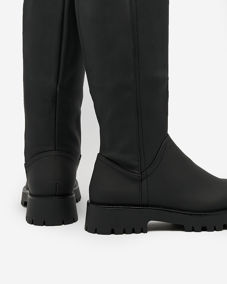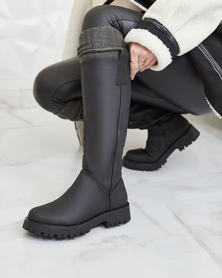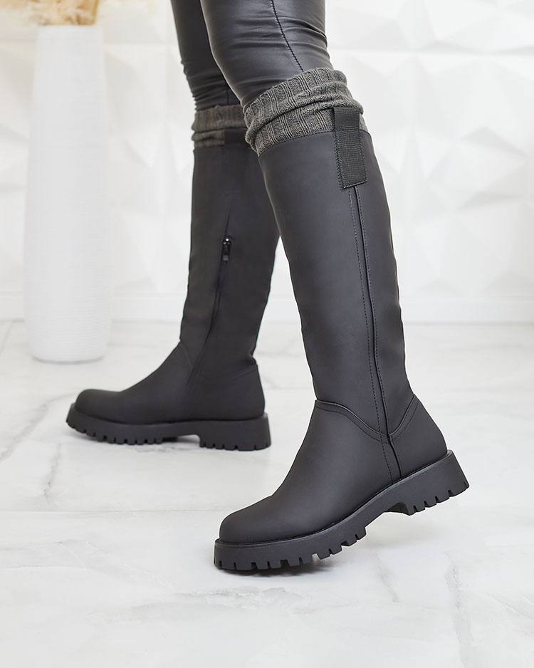 • Women's knee-high boots, made of matte eco leather. The model is on a flat heel and has a soft fur trim. The footwear is slip-on and has a mid-calf zipper closure.