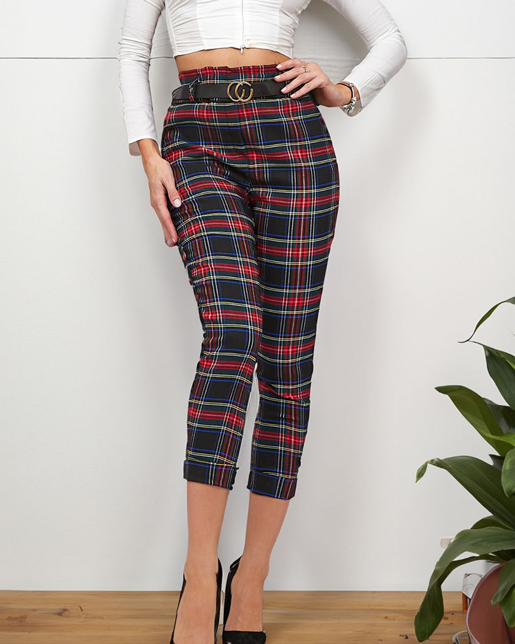 - Stylish women's fabric pants made of lightweight fabric in a checkered pattern. The model has an elastic waistband and 2 pockets. In addition, a belt included. Comfortable and convenient! NOTE: Measurement accuracy (+/-) 1 cm. Dimensions measured flat.