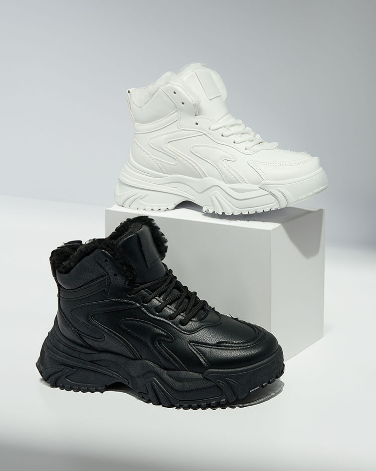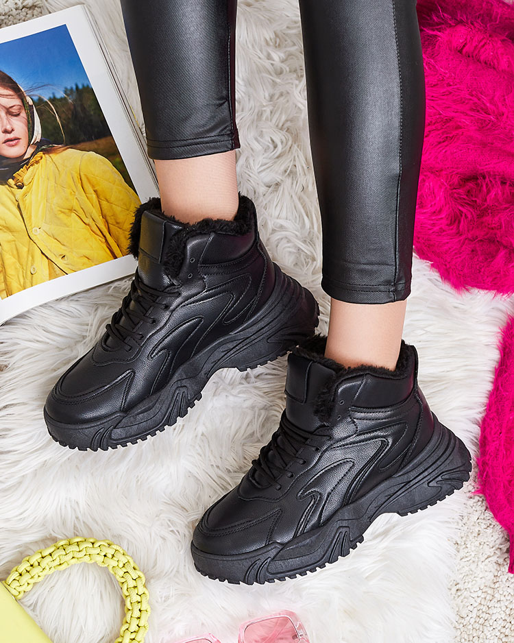 • Women's sporty sneakers on a thicker sole. Lace-up upper, made of ecological leather. Interior fully insulated with fur. Ideal for sports outfits!