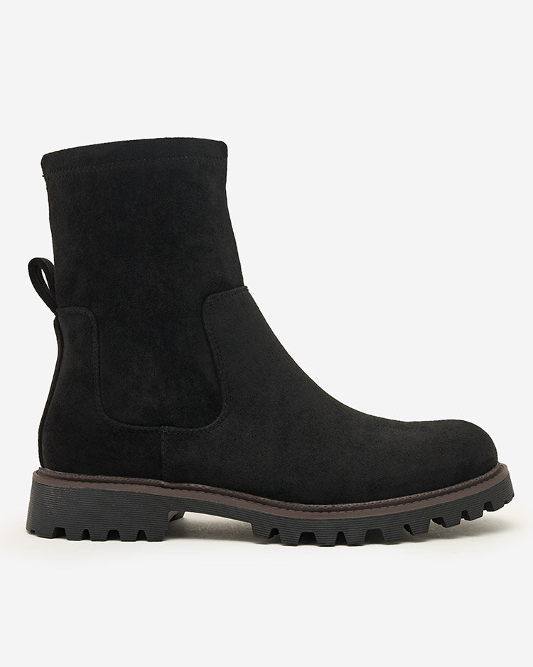 - Mega stylish, classic women's flat-heeled boots. The upper is made of eco-suede leather. The footwear has a fur insole. Slip-on model. A great choice for autumn!