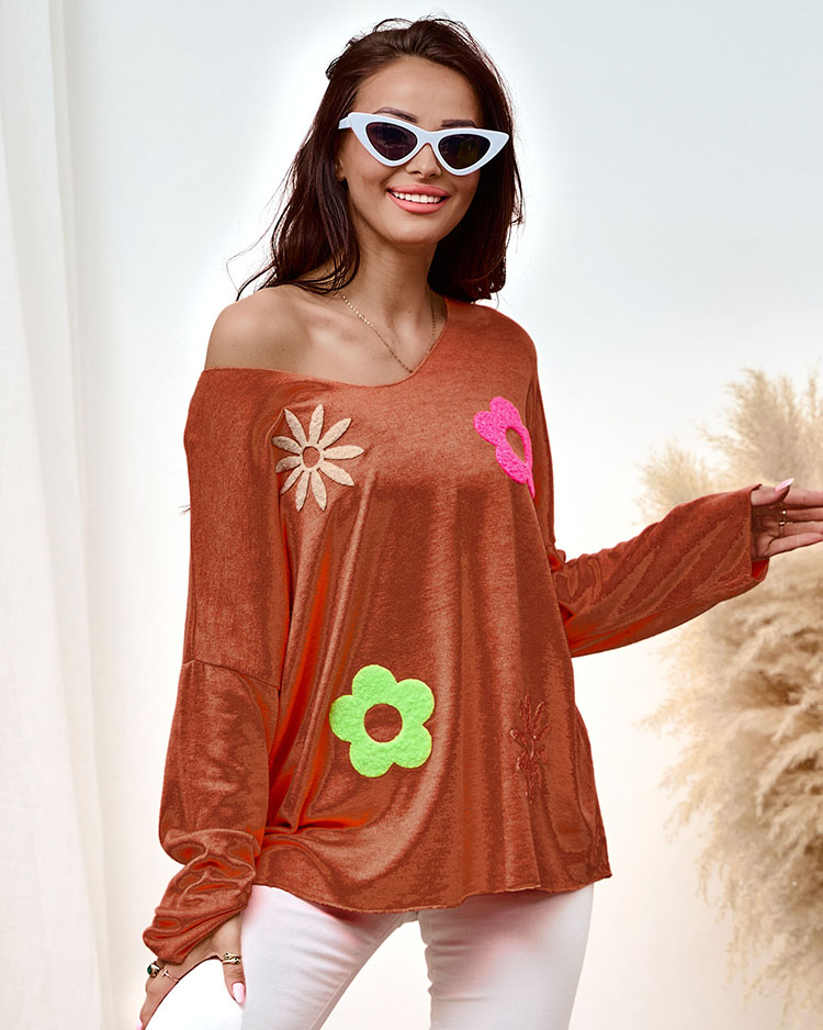 • Women's sweater with a heart neckline made of pleasant fabric. The model has long sleeves and flower-shaped patches. A perfect base for winter outfits!