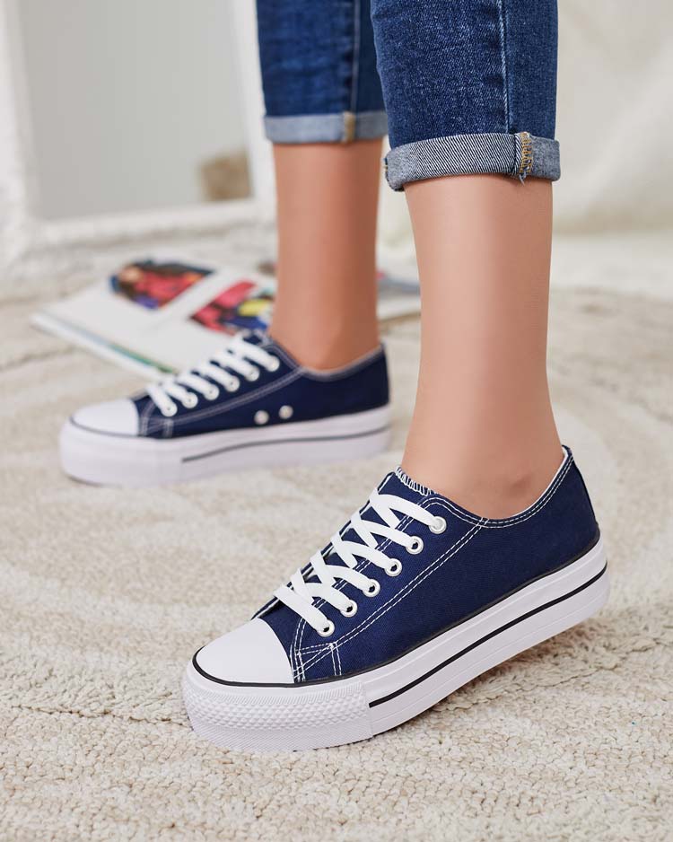 - Stylish women's sports sneakers made of fabric material. The model on a comfortable platform. The upper is laced. Great for creating casual outfits!