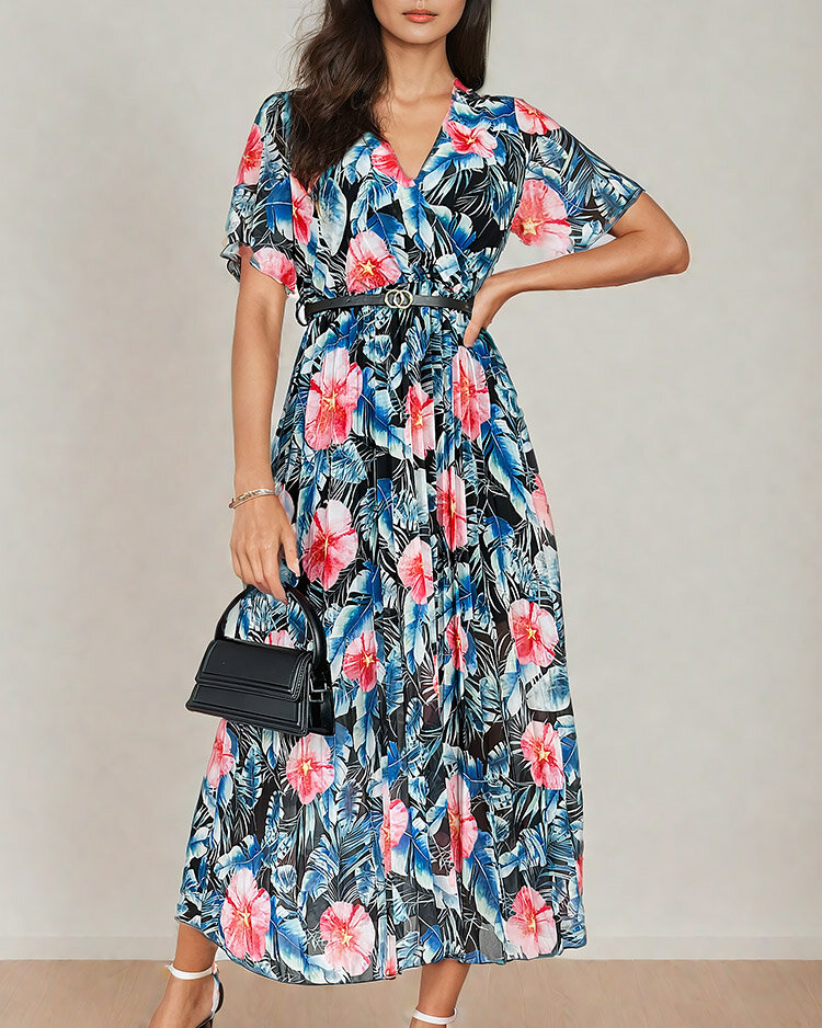 - A unique women's dress made of lightweight fabric with a floral pattern. At the height of the waist it has an elastic band. The product is midi length, has short sleeves and pleated trim. In addition, a belt is included. Feel the summer in this model!
