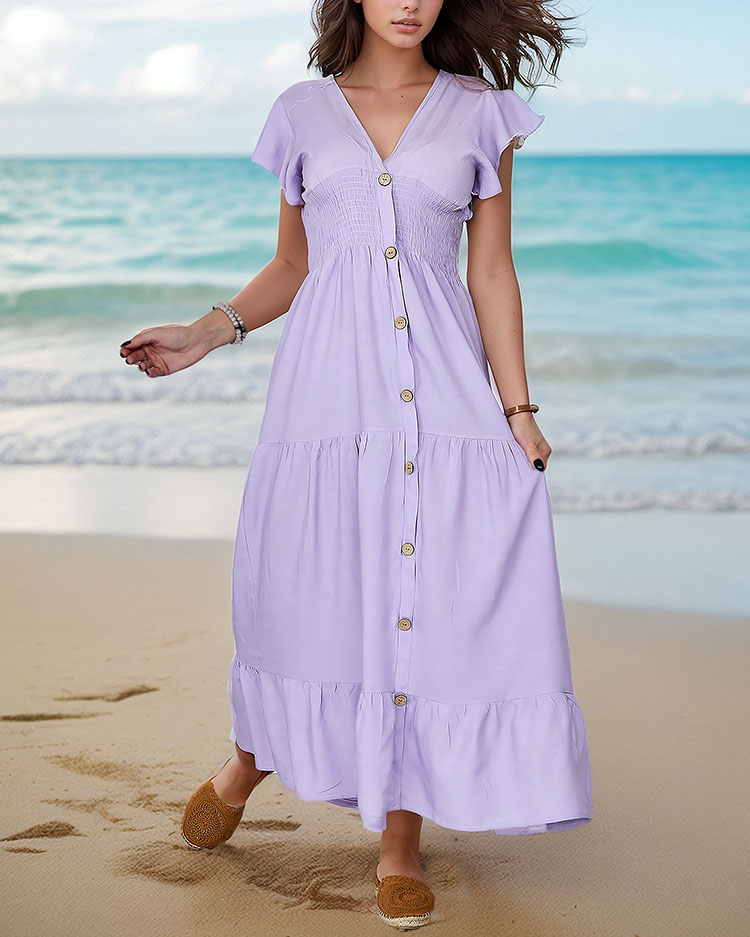 - Women's midi dress, with short sleeves and V neckline. Additionally decorated with buttons. Must have of this season! NOTE: Measurement accuracy (+/-) 1 cm. Dimensions measured flat.