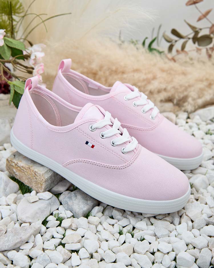 - Lightweight women's sneaker style sports shoes on a flat sole. Lace-up upper made of fabric. Inside the insole made of fabric material. Great for summer walks!