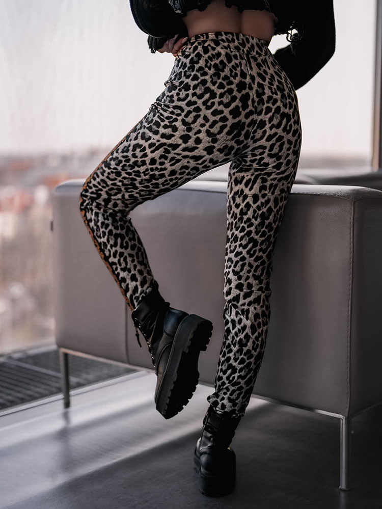 - Stylish leggings made of stretch fabric. Wide elastic waistband provides comfort of wearing. All decorated with animal print and zircons. Perfect for creating stylish outfits!