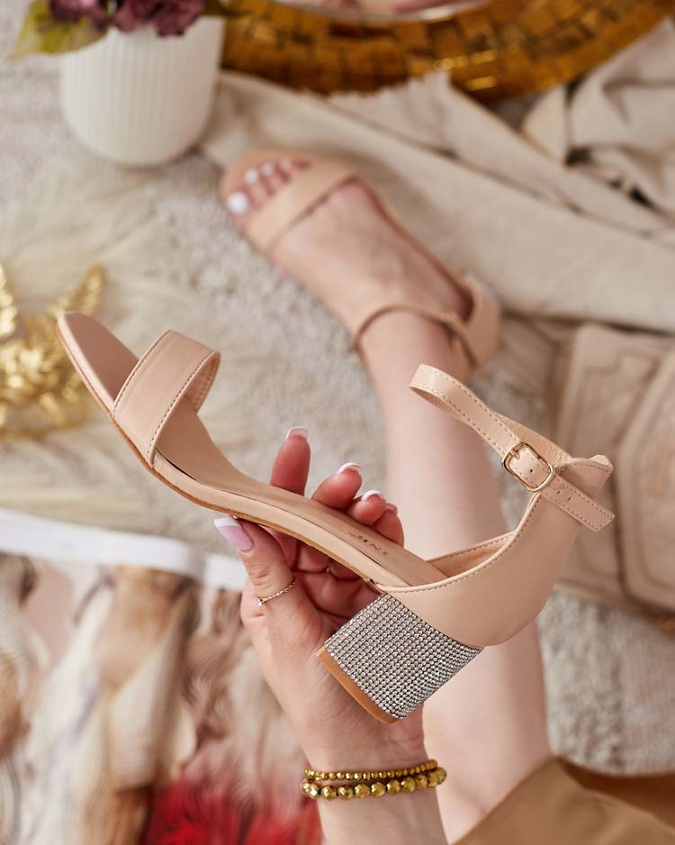 - Stiletto sandals made of eco leather and eco leather insole, fastened with a buckle. The pumps are on a comfortable post decorated with cubic zirconia which is far better comfort, and the buckle makes them easy to put on.