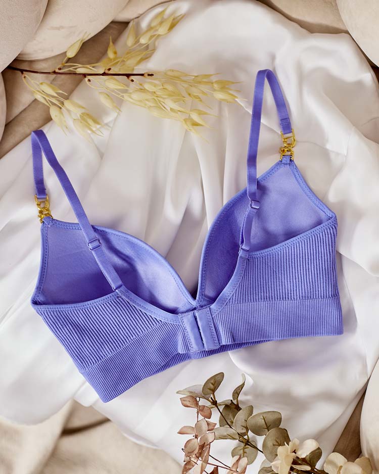 - Classic women's bra made of elastic, pleasant material. Model with decorative thin straps and with non-removable inserts, finished with elastic at the bottom. It will perfectly fit the body.
