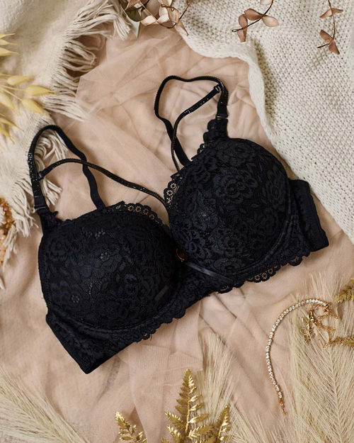 • Exceptional women's padded bra. Subtle finishes with delicate lace add to its elegance. The product is fastened at the back with hooks. The straps are detachable and adjustable. The model has decorative straps with zircons.