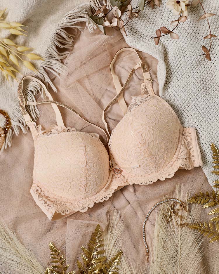 - Exceptional women's padded bra. Subtle finishes with delicate lace add to its elegance. The product is fastened at the back with hooks. The straps are detachable and adjustable. The model has decorative straps with zircons.