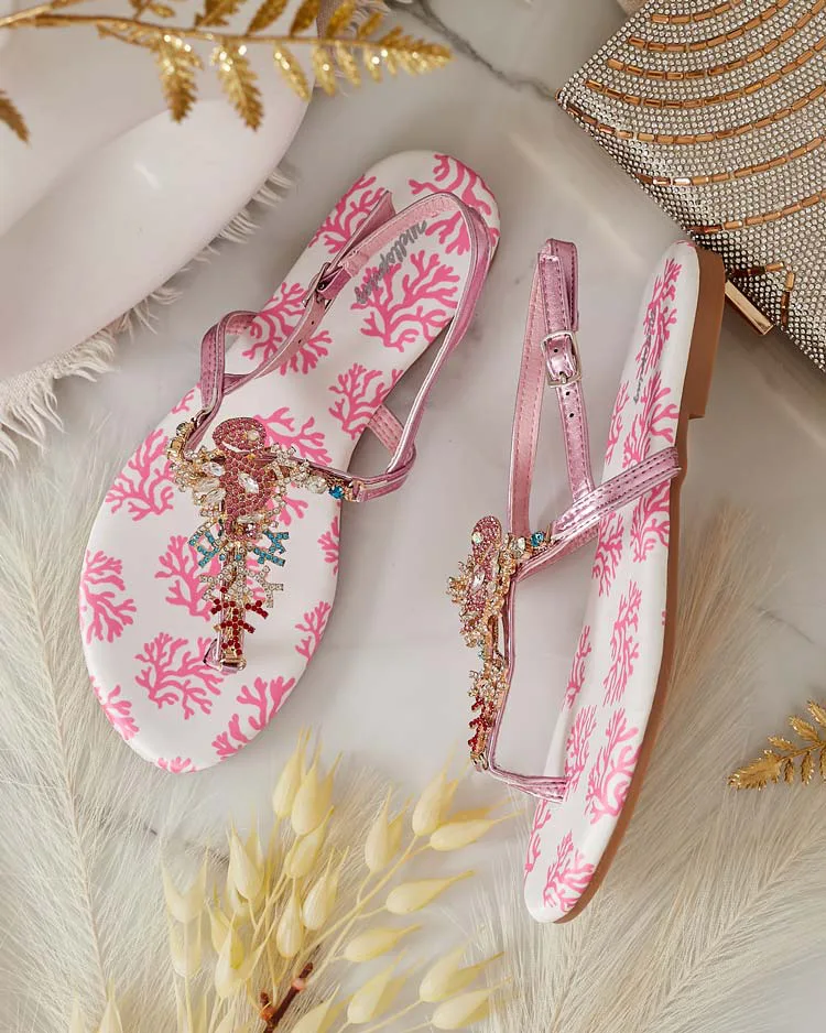 - Fashionable flat women's flip flop sandals, made entirely of eco leather. Fastened with a buckle with buckle decorations that add subtlety. Perfect for summer walks and special occasions!