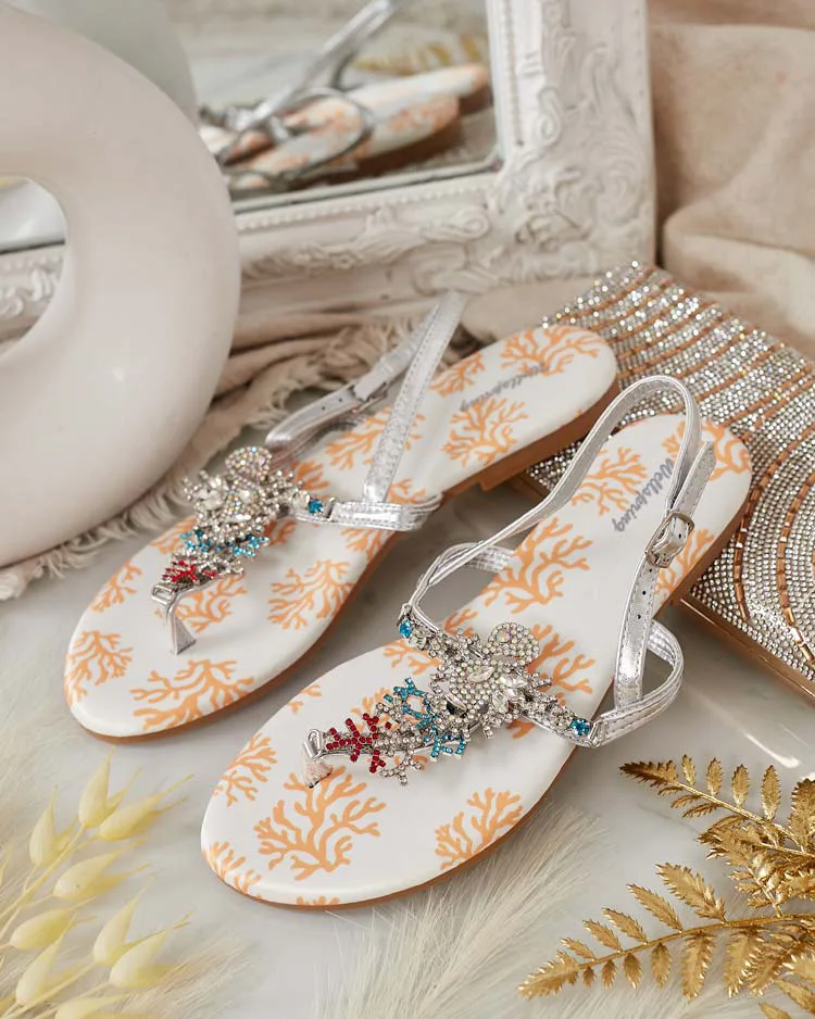 - Fashionable flat women's flip flop sandals, made entirely of eco leather. Fastened with a buckle with buckle decorations that add subtlety. Perfect for summer walks and special occasions!