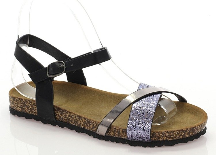 • Comfortable sandals made of eco leather. Front stripe decorated with glitter. Buckle on the side. They are perfect for warmer days.