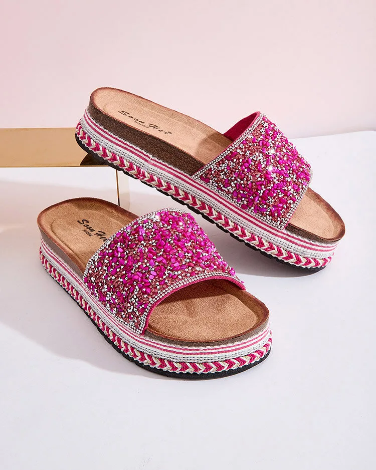 • These flip-flops on an embellished platform are a combination of style and comfort. Their decorative strap along with the ornamental sole add charm, emphasizing elegance. The eco suede leather insole provides softness and comfort with every step. These fl