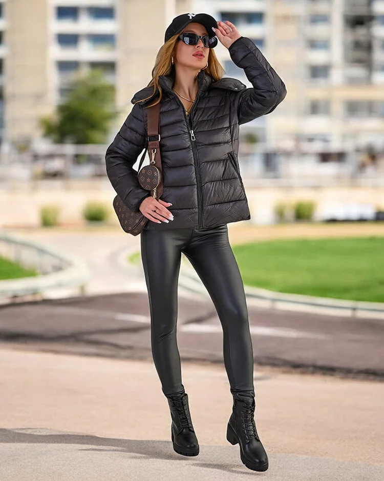 - Warm women's knee-length winter jacket with detachable hood. Quilted model, has 2 zippered pockets, synthetic down filling and zipper closure. NOTE: Measurement accuracy (+/-) 1 cm.