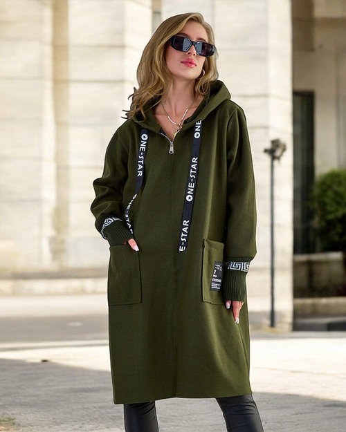 - Original women's coat resembling a hooded coat. The model has long sleeves and sewn pockets. The sleeves are finished with rubber bands for better fit and comfort. An ideal proposal for autumn! ATTENTION: Measurement accuracy (+/-) 1 cm.
