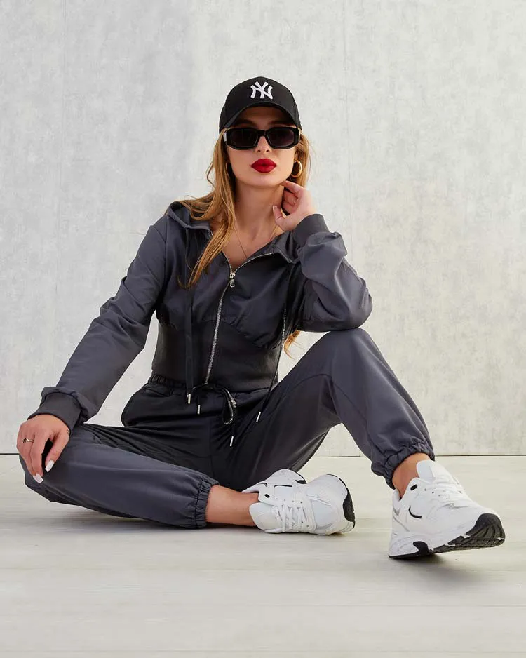 • Women's sweatshirt set made of pleasant fabric. Zippered sweatshirt with hood and pants with elastic waistband with pants and 2 pockets. Trousers decorated with zircons. NOTE: Measurement accuracy (+/-) 1 cm.