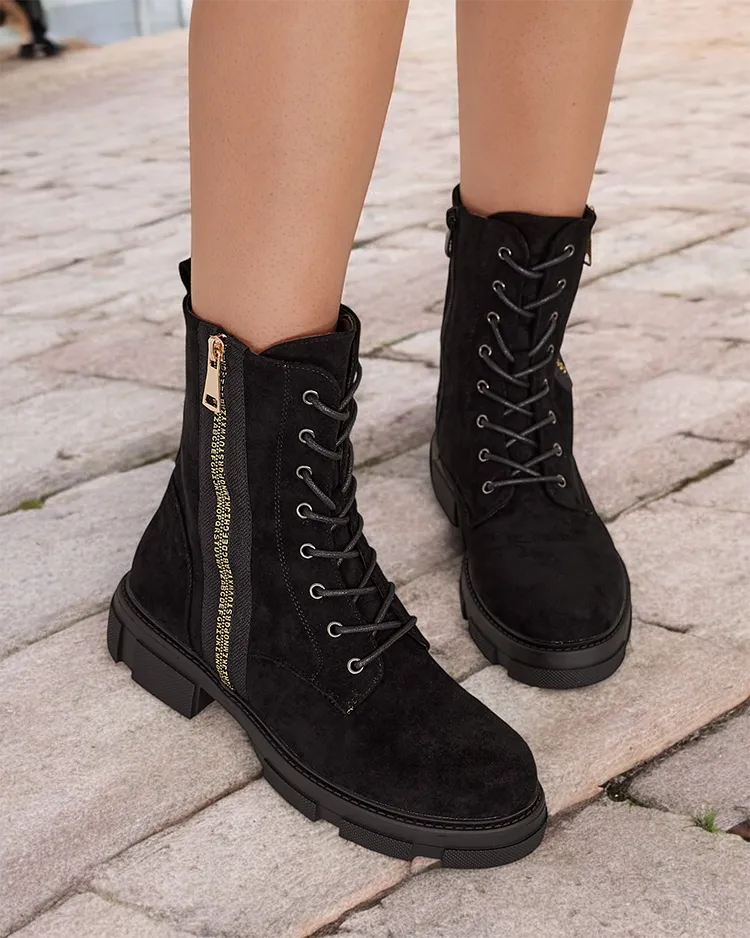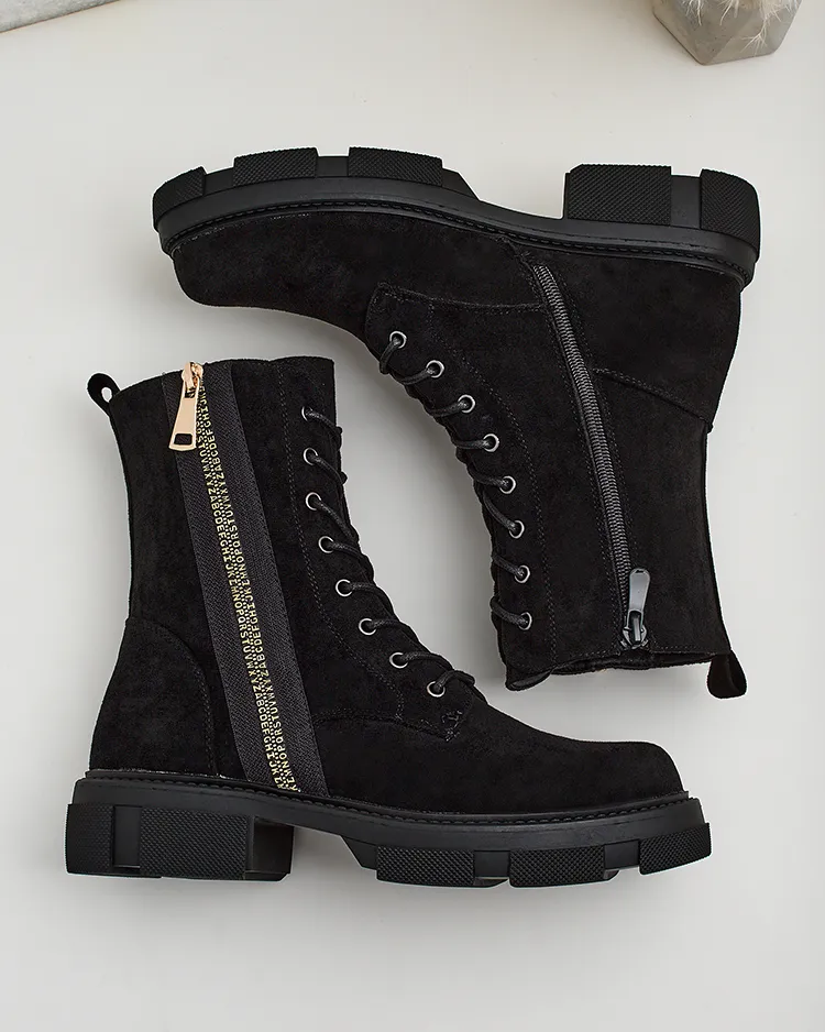 - Stylish bagger boots made of eco-leather. The boots are laced and zippered, have a thicker rubber sole and fur filling. Perfect for autumn!