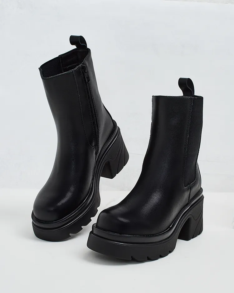 • High boots for women on a thicker platform. Footwear entirely made of ecological leather. Shoes fastened by a zipper. An ideal choice for autumn!
