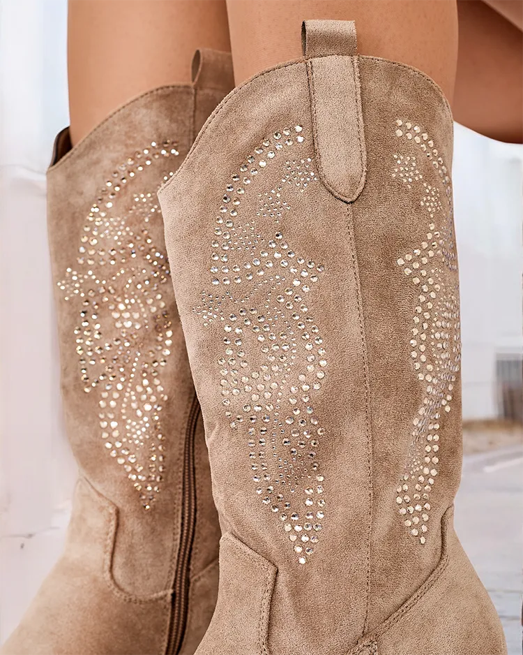 - Boots a'la cowboy boots with a low heel, made of organic suede leather decorated with zircons. The inside is lined with soft fur, boots with a zipper to the middle of the calf. They fit to many women's styling!