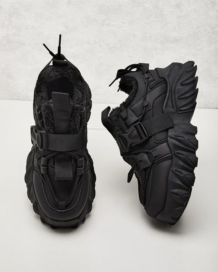 - Women's sporty sneakers on a thicker sole. Lace-up upper, made of ecological leather. Interior fully insulated with fur. Ideal for sports outfits!