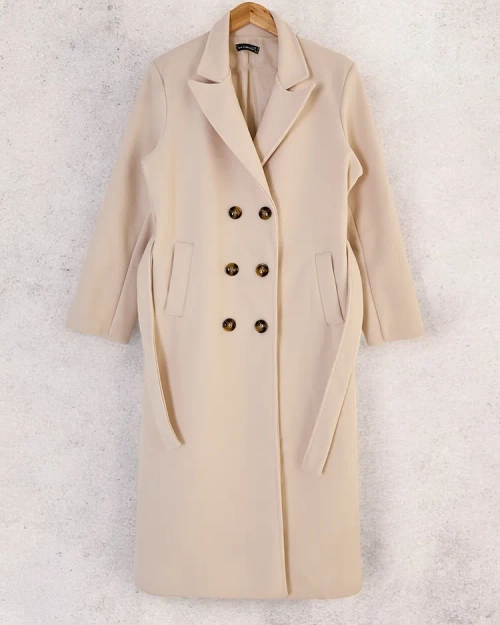 - Long women's coat made of pleasant material. The model has long sleeves, button closure and decorative binding. It has a lining. An ideal choice for autumn! NOTE: Measurement accuracy (+/-) 1 cm. Dimensions measured flat.