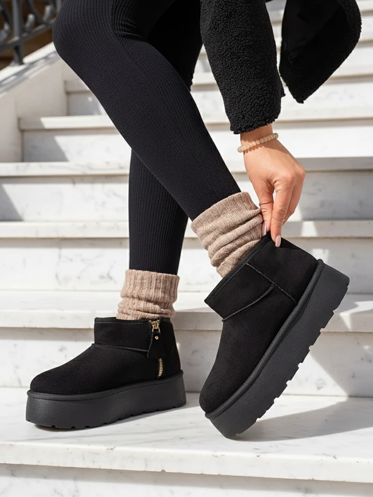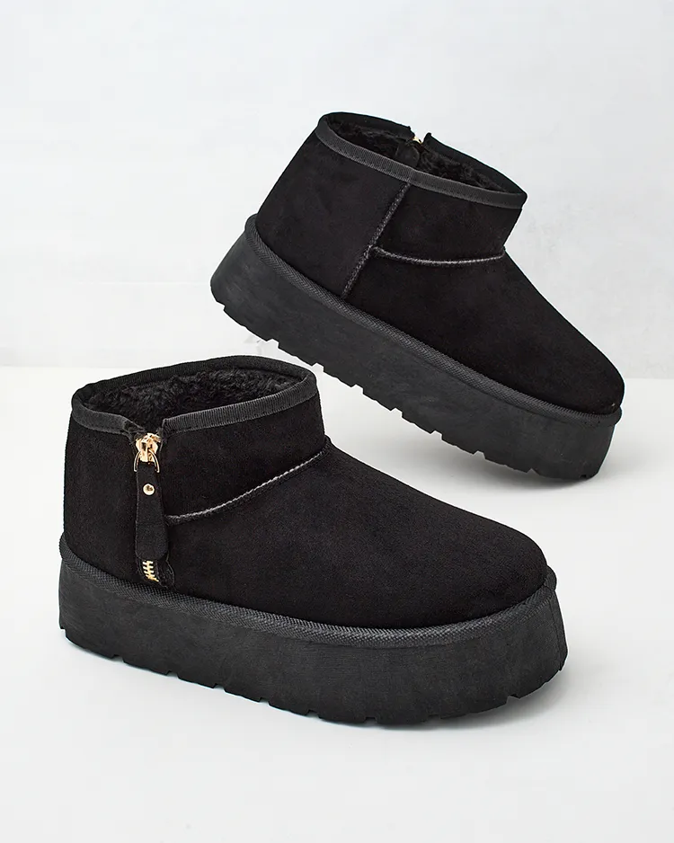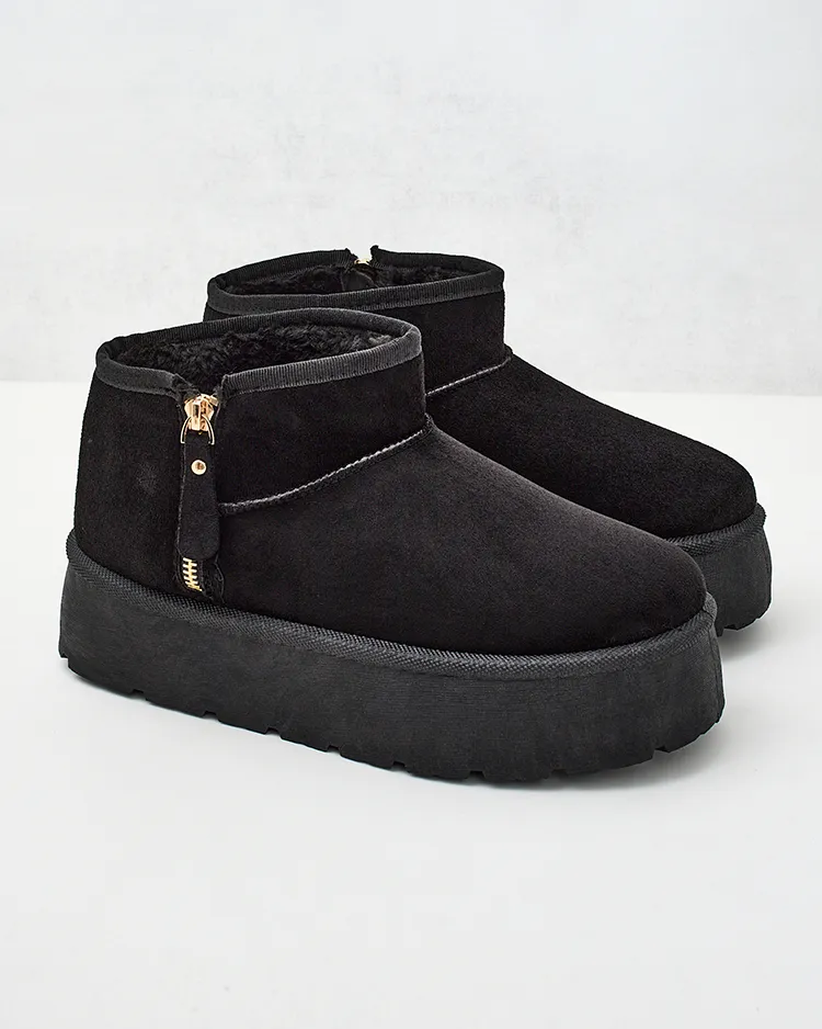 - Great women's winter platform snow boots. The upper is made of organic suede leather, the middle is insulated with fur. The model has a decorative zipper. Ideal base for winter!