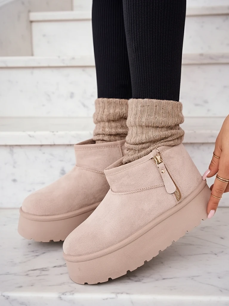 - Great women's winter platform snow boots. The upper is made of organic suede leather, the middle is insulated with fur. The model has a decorative zipper. Ideal base for winter!