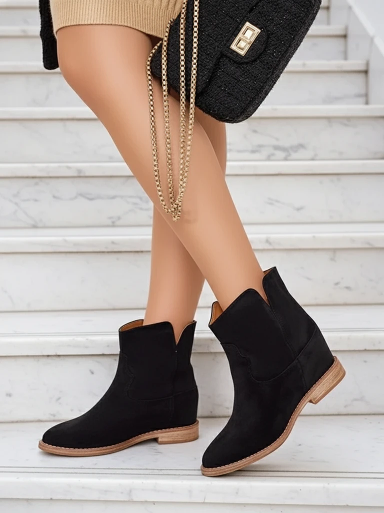 • Classic cowboy-style ankle boots on a covered wedge made of gray eco-suede. Women's shoes have a fur lining. Boots are a great addition to pants and dresses!