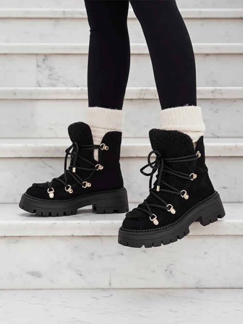 • Women's snow boots with an upper made of a combination of eco suede leather and a' la sheepskin material. Lined with fur inside, slip-on and lace-up shoes. Perfect for winter!