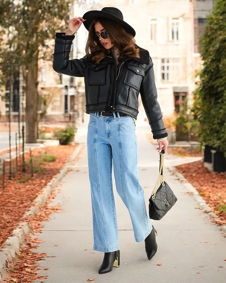 - Women's eco-leather jacket with fur inserts. The model has 2 pockets and a zipper closure. Lined inside with warm fur-like material. Perfect addition to autumn outfits!