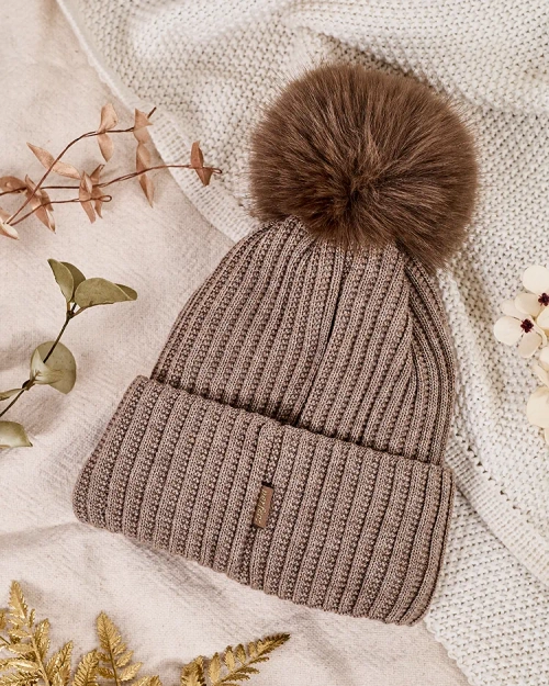- Beautiful women's insulated winter hat, made of knit fabric. Model with soft fleece lining, decorated with a fluffy pom pom. Perfect for cold and winter days!