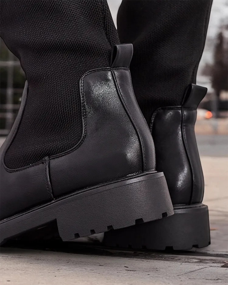 - Stylish women's knee-high boots on a thicker sole. The upper is made of flexible fabric material with eco leather inserts, inside fabric and fur insole. Slip-on model. Perfect for everyday autumn outfits!