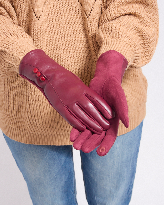 - Warm women's gloves made of a combination of eco leather and fabric. Inside, there is a thin fur lining. A satin patch on the index finger allows for touchscreen operation.