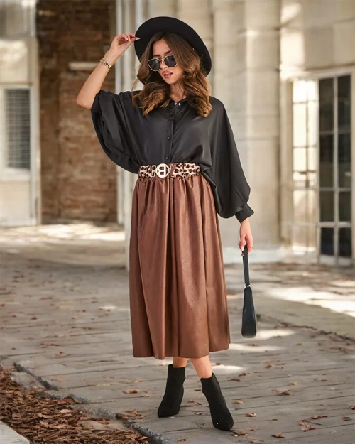 • Stylish women's midi skirt, made of eco leather, with an elastic waistband and decorative belt. A flared skirt. A must-have in every woman's wardrobe!