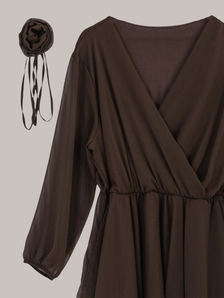 - Elegant, timeless knee-length women's dress with a wrap neckline and an elastic waistband. The dress has long sleeves made of mesh and a decorative additional tie with a flower. Great choice for an evening out!
