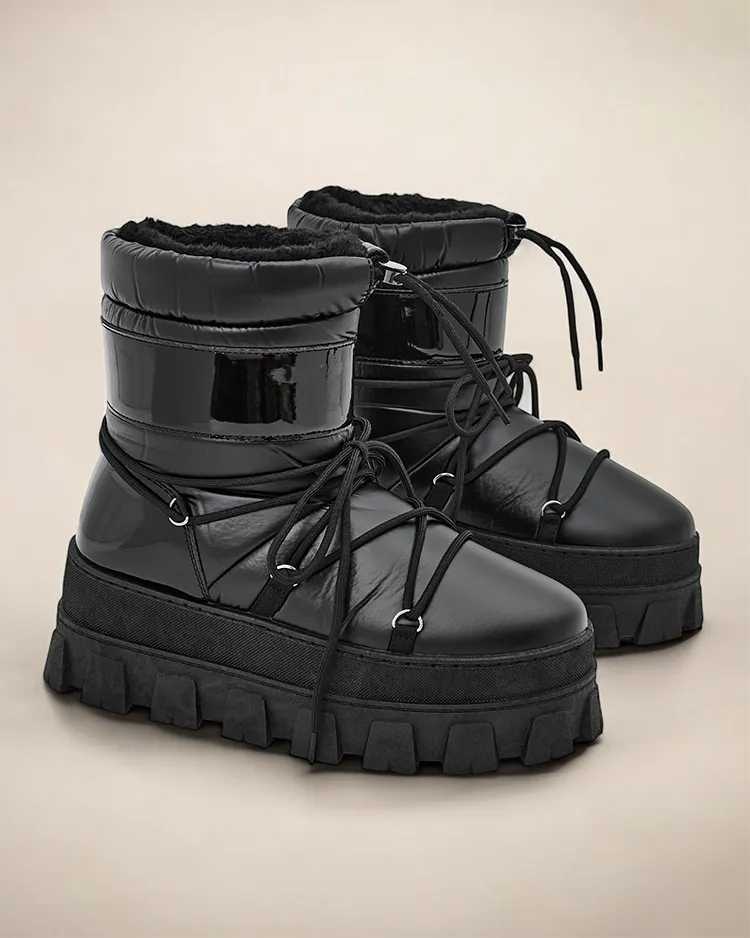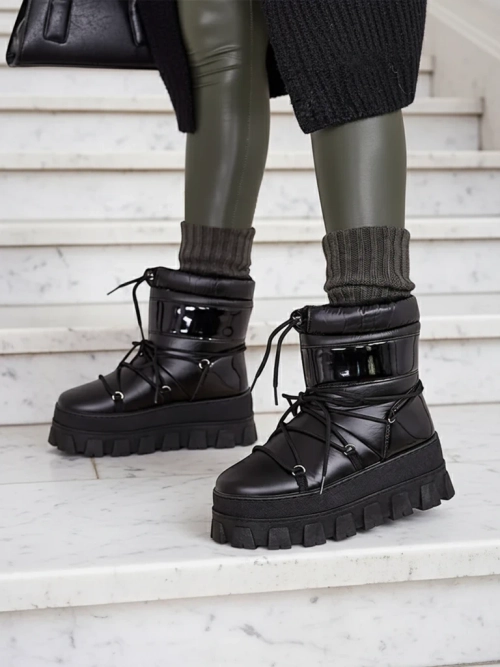 - Women's snow boots with upper made of a combination of canvas-like fabric and patent leather. Inside, there is a pleasant fur lining, slip-on and lace-up shoes. Perfect for winter!