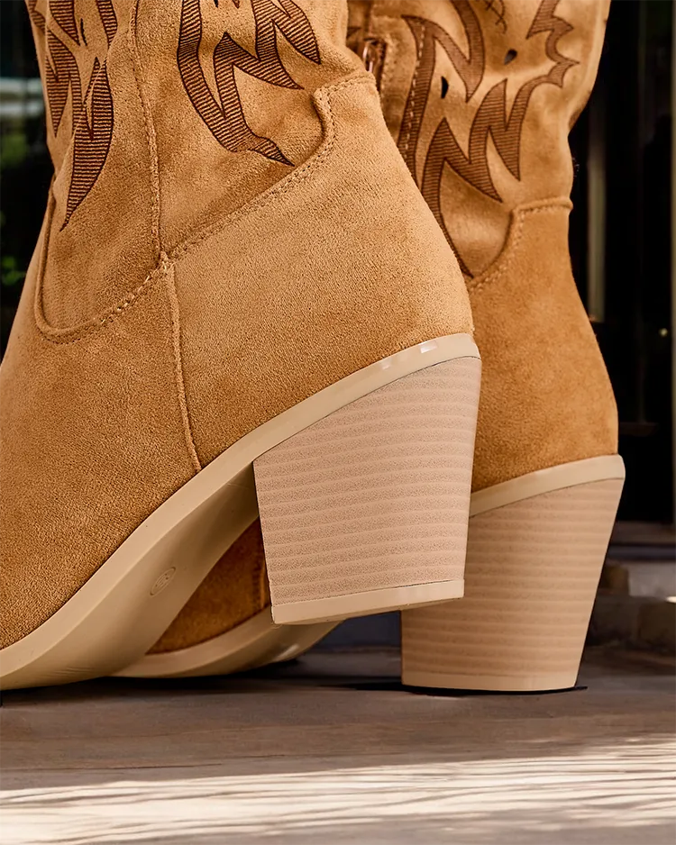 - Boots in cowboy style with heel, made of faux suede leather. Eco leather insole, shoes fastened with a zipper, adorned with embossing. They match many feminine stylizations!