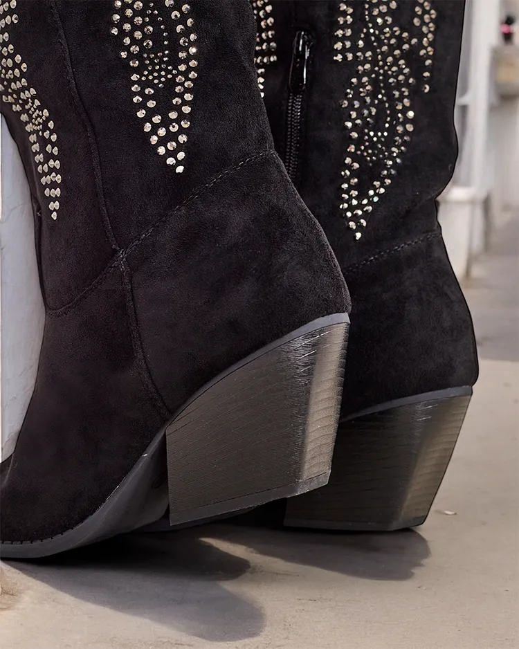 • Boots reminiscent of cowboy style, made of ecological suede leather. Eco leather insole, shoes fastened with a zipper, decorated with zircons. They match many feminine stylizations!
