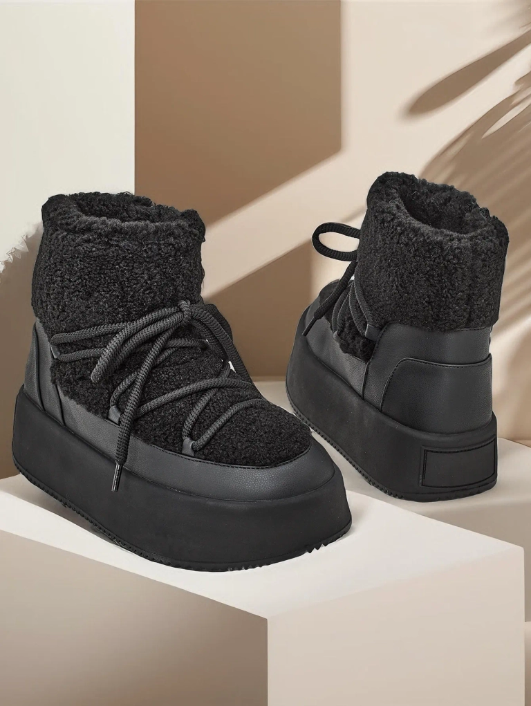 - Women's snow boots with a shaft made of a combination of eco leather and pleasant fabric. Inside, there is a nice fur lining, the shoes have a zipper and a laced shaft. Perfect for winter!