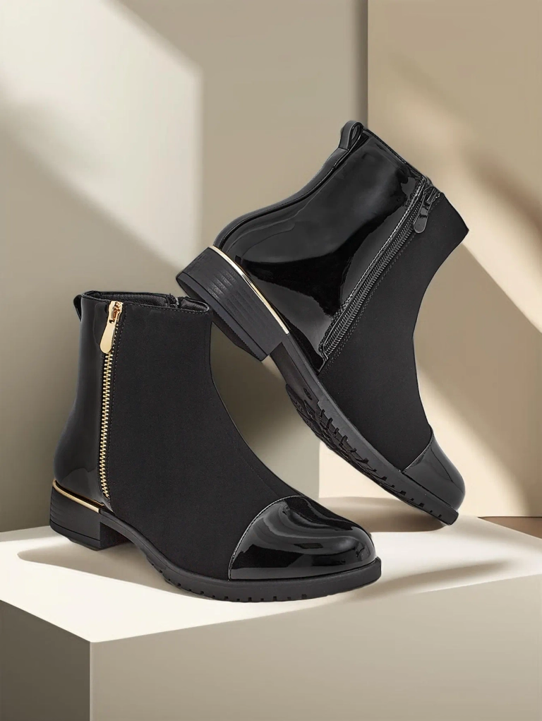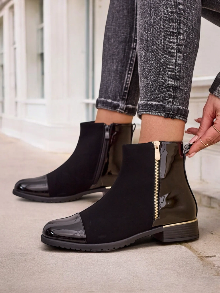 - Fantastic women's flat-heeled boots, made of matte eco leather with patent leather inserts. The interior is made of comfortable fur. Model fastened with a zipper. Perfect for autumn outfits!