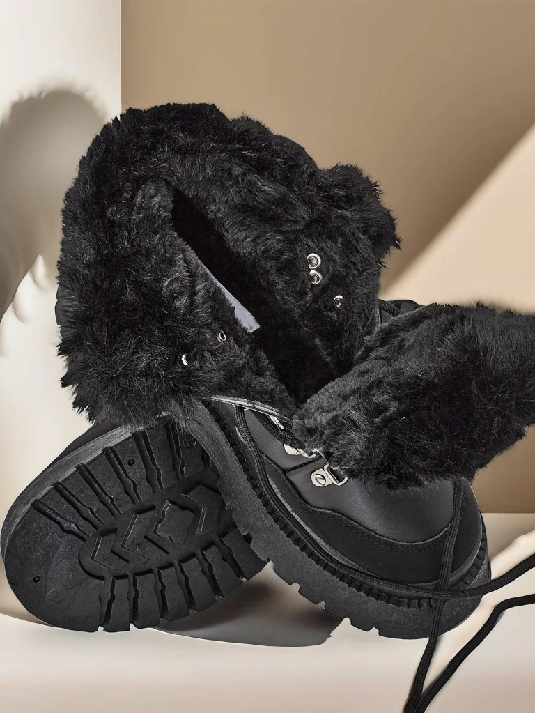 - Women's snow boots with eco leather upper. Lined with fur inside, slip-on and laced footwear. Perfect for winter!