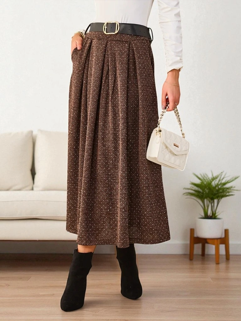 - Women's midi skirt made of soft fabric. The model has 2 pockets and a belt included. Perfect base for many unique outfits! NOTE: Measurement accuracy (+/-) 1 cm.