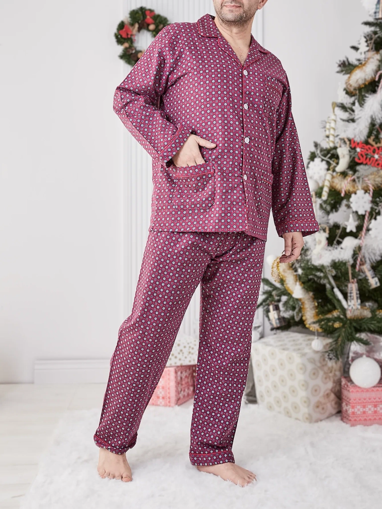 - Men's pajamas with a trendy print, made of cotton material. The model has long sleeves and pants. Top fastened with buttons. Comfort and elegance in one!